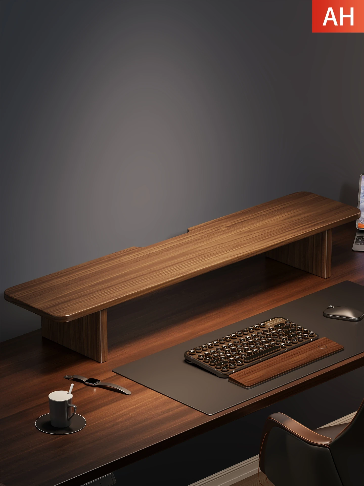 天然木製のパソコンモニター昇降スタンド|デスクトップ用ウィルドウキャリーラック|ウォールナット仕上げで広々としたベース|快適なオフィス環境を実現!
